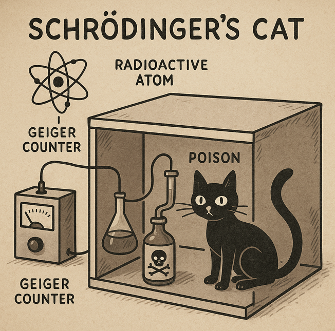 The famous thought experiment places a cat in a sealed box with a radioactive atom that may or may not decay within an hour. If the atom decays, a mechanism releases poison and the cat dies. Until someone opens the box, we don’t know whether the cat is alive or dead. In quantum mechanics, the system is described as being in a superposition — the cat is both alive and dead at the same time.
